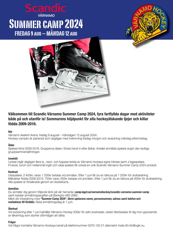 Välkommen till Scandic Värnamo Summer Camp 2024, fyra fartfyllda dagar med aktiviteter både på och utanför is! Sommarens höjdpunkt för alla hockeyälskande tjejer och killar födda 2009-2016.