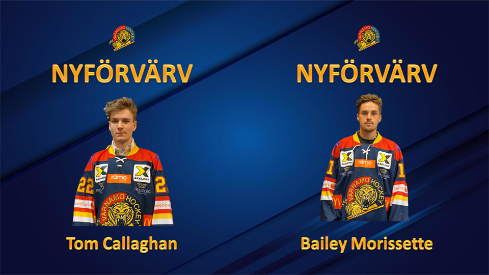 Värnamo Hockey har gjort klart med Tom Callaghan och Bailey Morissette. Spelarna gör sin första träning med laget idag och är förhoppningsvis spelklara till matchen mot IK Guts på onsdag. Både Tom Callaghan och Bailey Morissette är födda 1999 och de är båda uppväxta i den kanadensiska delstaten Quebec. De kommer närmast från att ha spelat tillsammans i West Island Shamrocks i den kanadensiska juniorligan QJAAAHL. Tom är 180 cm lång och väger 77 kg. Han är en högerfattad forward som har producerat en hel del poäng under sina år i olika kanadensiska juniorligor. Under förra säsongen producerade han 36 poäng, fördelat på 15 mål och 21 assist, på 27 matcher. Bailey i sin tur är en till växten ganska liten spelare, 171 cm och 76 kg. Han är en vänsterfattad forward med ett bra sinne för målet. Förra säsongen blev det 59 poäng, fördelat på 32 mål och 27 assist, på 46 matcher. Tom kommer att bära nummer 17 och Bailey nummer 11.