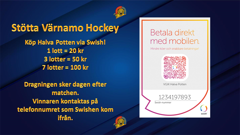 Nu på onsdag den 14/10 möter vi IK Guts kl. 19.00 i Axelent Arena. Vi kommer att ta in 50 personer i publiken och i nuläget finns det ett tiotal platser kvar. Säkra er biljett genom att skicka ett mail till info@vgik.nu, det är även möjligt att ringa 0370-12021 mellan 10.00-14.00. Endast förköp gäller. Det kommer INTE att ske någon försäljning på plats. Entrévärdarna har en lista med de som har biljetter till matchen. Står man inte med på listan så kommer man inte kunna se matchen på plats. Vi ber er att följa Folkhälsomyndighetens råd och anvisningar. Har ni minsta lilla symptom så måste ni stanna hemma. På plats i Axelent Arena vill vi påpeka att ni tänker på att sprida ut er och hålla avstånd. Köp Halva Potten via Swish En nyhet till onsdagens match är att vi kommer att sälja Halva Potten via Swish. Ni Swishar er summa till 1234197893, kostnaden för lotterna är enligt följande: 1 lott = 20 kr, 3 lotter = 50 kr och 7 lotter = 100 kr. Dragningen sker på förmiddagen dagen efter matchen. Vinnaren kommer att kontaktas på telefonnumret som Swishen kom ifrån. Livesändning på SvenskhockeyTV Matchen kommer att sändas live på SvenskhockeyTV. Ni hittar till matchen genom att följa den här länken. För att kunna se matchen så köper du antingen ett årsabonnemang för 995:- eller ett månadsabonnemang för 129:-. Väljer du att köpa årsabonnemang så kan du välja Värnamo Hockey som favoritförening, då går 200:- direkt till föreningen.