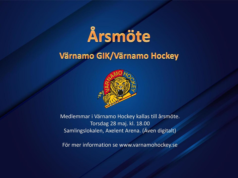 Medlemmar i Värnamo Hockey kallas till årsmöte torsdag 28 maj kl. 18.00 i samlingslokalen, Axelent Arena. I och med Covid-19 situationen har styrelsen varit i kontakt med RF för stöd i frågan runt hur vi skall kunna hantera vårt årsmöte. Utefter denna diskussion beslutade styrelsen att årsmötet hålls torsdagen den 28:e maj kl. 18:00. För att vi skall kunna följa rådande rekommendationer vill vi att ni anmäler er antingen via denna länken Länk till Anmälan eller ring kansliet (0370- 120 21) så hjälper de till med att anmäla Er på hemsidan. Anmälan skall ske senast 14 dagar innan årsmötet. Vi kommer även se till att möjlighet finns för de som befinner sig i riskgruppen att kunna delta i mötet digitalt. Ytterligare information om detta kommer gå ut via mail till de som anmäler sig. Möte eller ring kansliet (0370- 120 21) så hjälper de till med att anmäla Er på hemsidan. Med vänlig hälsning Styrelsen Värnamo Hockey